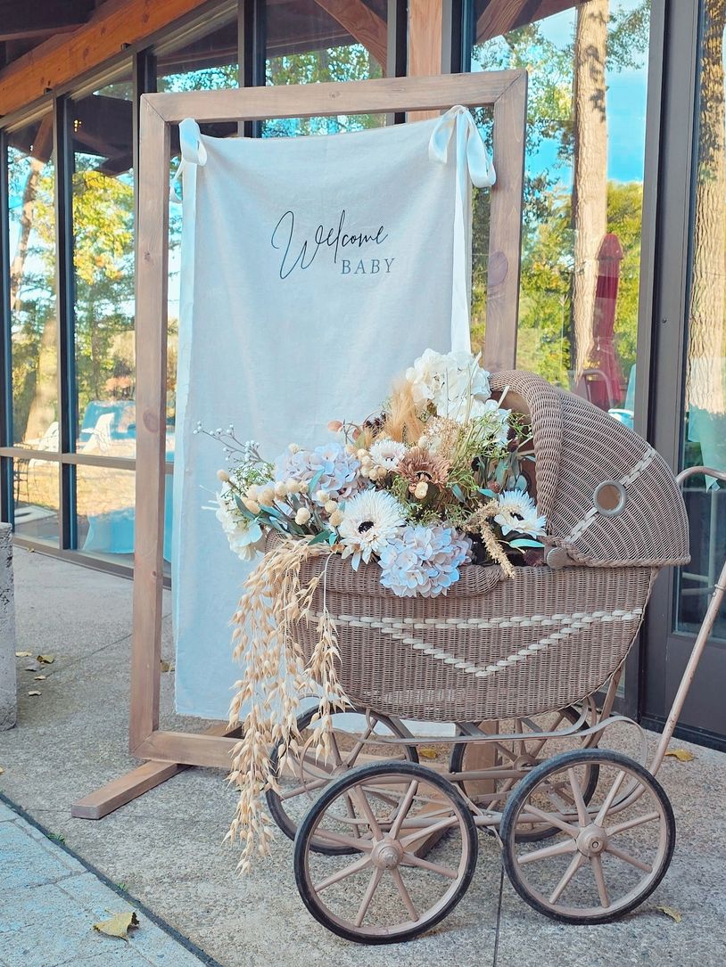 This options features our vintage baby buggy & "Welcome Baby" linen sign
